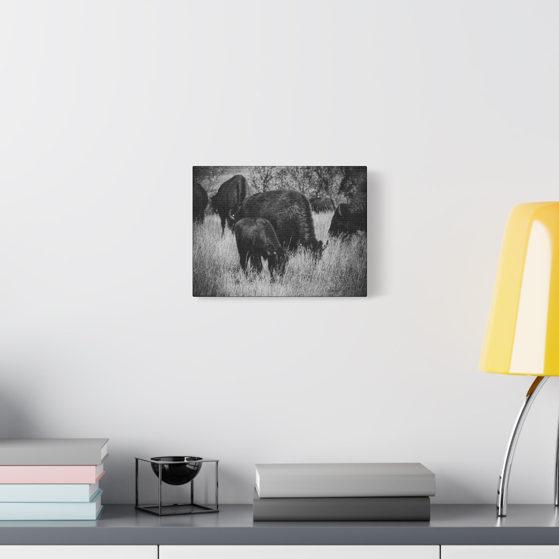 Transform your living space with this stunning Canvas Print, showcasing a captivating black and white image of majestic buffalo grazing. This artwork brings a serene, natural vibe to any room, making it a perfect addition to your home or office. Ideal for animal lovers or those who appreciate the beauty of wildlife, this canvas serves as a bold statement piece that sparks conversation. Perfect for gifting on occasions like housewarmings, birthdays, or to celebrate nature-themed events. Placing it in your living room, study, or even a cozy library will create an inviting and tranquil atmosphere, allowing you to escape into the beauty of the outdoors.