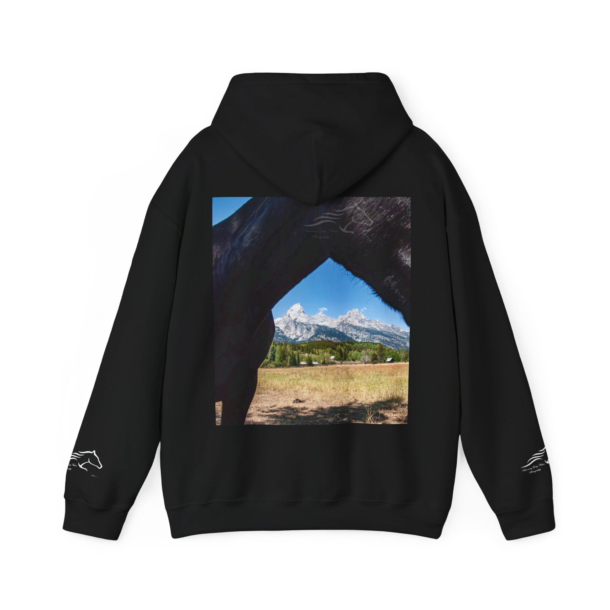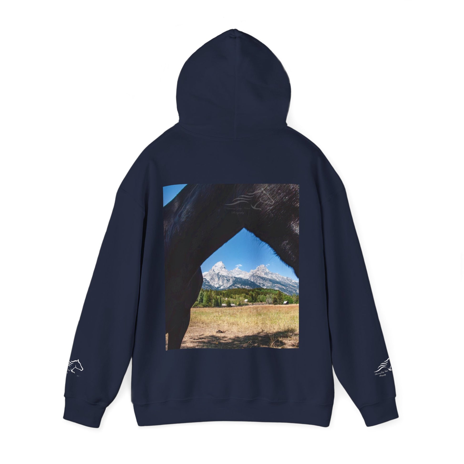 This cozy hooded sweatshirt brings quiet adventure into everyday wear. A minimalist line-art horse on the chest and wrists adds a subtle, equestrian touch, while a framed landscape photo on the back opens into a wide, sunlit valley—like a private window to the trail. Thick, double-lined hood and color-matched drawcord keep the silhouette clean and durable. The roomy kangaroo pocket and soft medium-heavy blend give it a lived-in comfort that invites long drives, early mornings at the barn, or slow weekends exploring back roads. It feels familiar the moment you pull it on, carrying the calm of open fields and the steady rhythm of hooves.